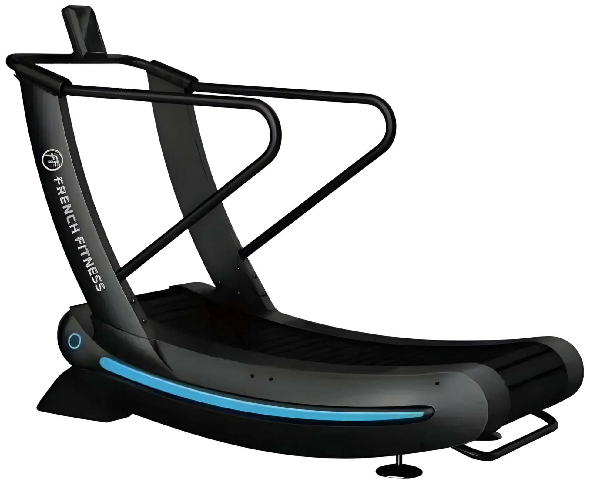 The French Fitness CT50 Manual Curve Treadmill w/Resistance offers a unique and challenging workout experience that can help improve running performance, burn more calories, and provide a more engaging and dynamic workout. Features magnetron resistance adjustment which uses a magnetic brake to create resistance, which can be adjusted to increase or decrease the intensity of the workout. The CT50's curved deck allows for a more natural and challenging running experience. Works by using the natural motion of the user to power the machine. The curve of the belt creates a slight incline, which requires the user to exert more effort to maintain their pace. As the user walks or runs on the curved belt, the force of their stride causes the belt to rotate. This rotation creates a resistance that requires the user to exert more effort to maintain their pace. This resistance engages more muscles in the lower body, particularly the glutes, hamstrings, and calves, increasing the intensity of the workout and providing a more challenging experience for the user. In addition, the resistance adjustment knob simulates different running states to provide a more challenging and dynamic workout that engages more muscles and burns more calories.