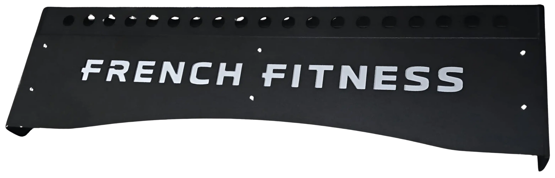 The French Fitness Rack & Rig 43" Junction Bar Nameplate Crossmember is used to connect the uprights of the rig, allowing for the attachment of various accessories and components. They serve as a crucial component in the overall stability and strength of the rig, as they help distribute the load and provide structural integrity.