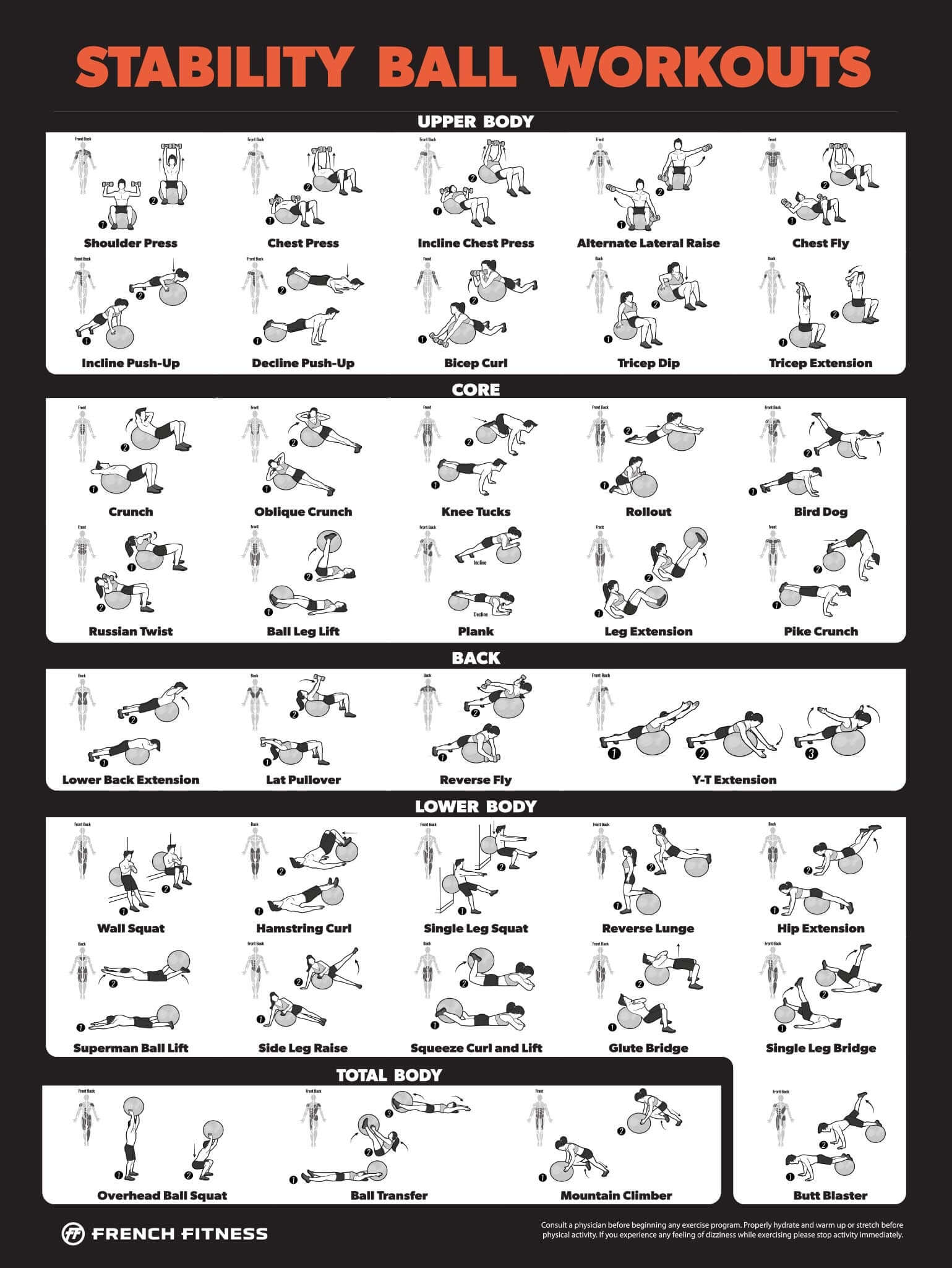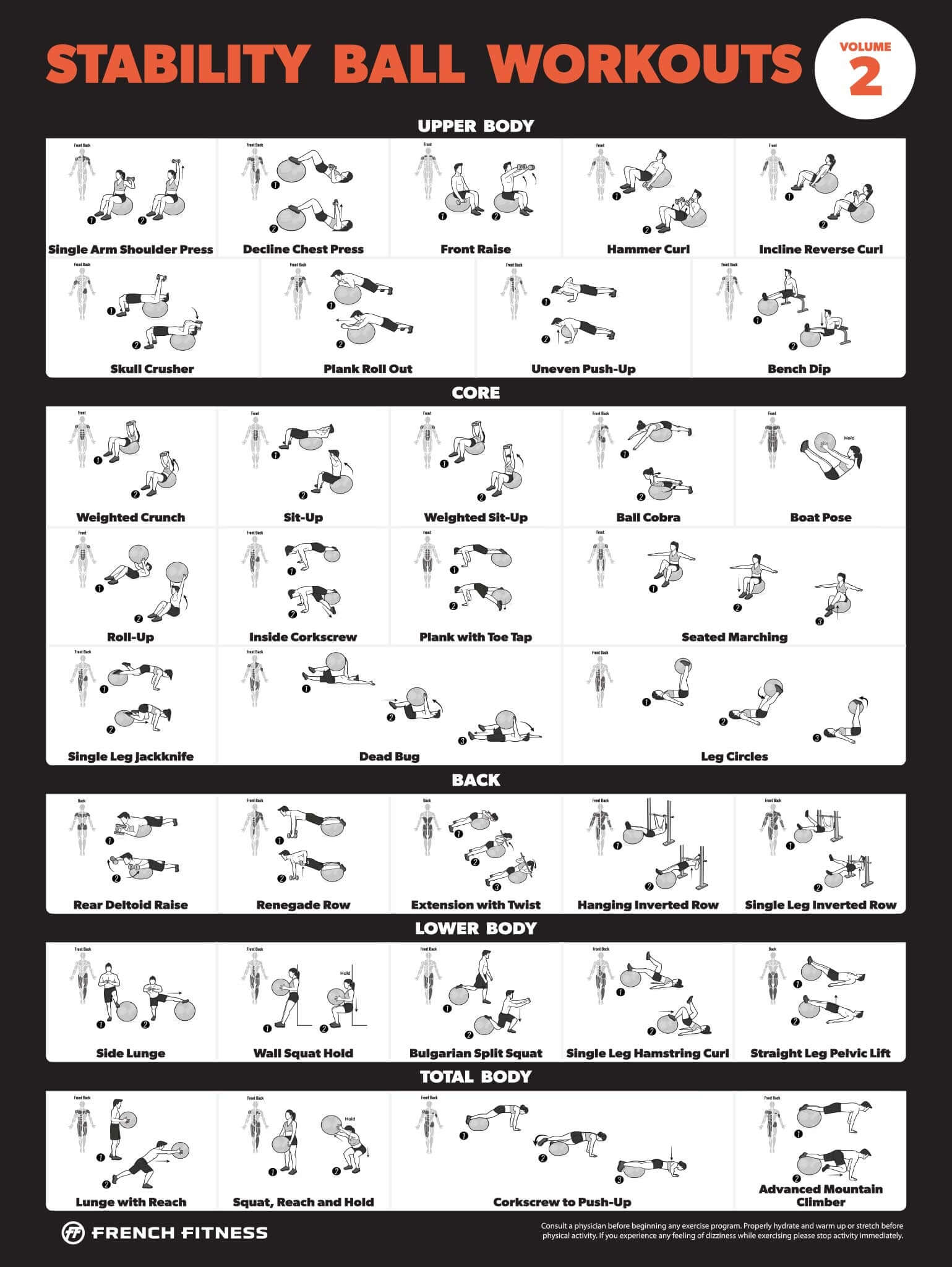 The French Fitness Stability Ball Workout Training Charts / Posters take your workouts to the next level, a professional 2-volume set designed to make stability ball training simple, effective, and motivating. Featuring step-by-step stability ball exercises, these posters help you strengthen your core, improve balance, and enhance flexibility right from your home gym, personal training studio, or commercial fitness center. Perfect for beginners and advanced athletes, each chart highlights proper form and targeted muscle groups to ensure safe, results-driven training.