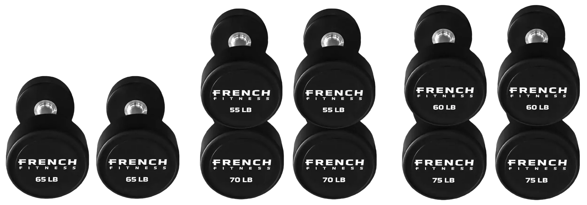 French Fitness Urethane Round Pro Style Dumbbell V2 Set, 55-75 lbs (New)