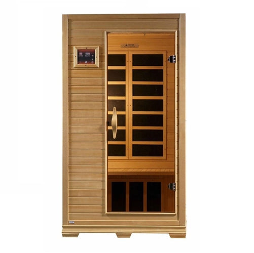 | Golden Designs PureTech™ Near Zero EMF Saunas are constructed with the environment in mind which accounts for our efforts in using Reforested Canadian Hemlock wood. Our sauna walls are double paneled constructed with the thickest interior and exterior wood planks compared to others in the same industry. This all translates to a quality sauna that retains heat more efficiently, heats up faster and wastes less energy. Golden Designs 1-2 Person model offers 6 PureTech™ Near Zero EMF infrared Carbon Energy Efficient heating panels (including an industry leading foot heater) that produce a wider, softer heat that is evenly distributed throughout the sauna. Our PureTech™ Near Zero EMF infrared Carbon Energy Efficient heating panel heaters are 30% larger than saunas heated by ceramic tubes and penetrate skin 40% more to maximize therapeutic benefits. Unlike ceramic heaters, you will never have to replace our Carbon Energy Efficient heating panels. Unlike traditional rock and water saunas (which heat at or over 200F and do not penetrate your skin), Golden Designs Saunas operate at a much lower and safer 130F. In fact, Golden Designs Saunas operate most effectively at 120F thus allowing you to enjoy the sauna longer and maximize all potential health benefits. Golden Designs 1-2 person sauna is designed for ease of use and is an outstanding value. Assembly is a snap and takes less than 1 hour. Enjoy the convenience of operating a Golden Designs Sauna with our dual (int. and ext.) soft touch control panel and LED display featuring sauna temperature and time functions. Play your favorite music through the saunas built in Bluetooth - AUX connection with speakers. The sauna plugs into any dedicated 15 amp 110 volt outlet so no special wiring is required and the sauna may be installed on carpet and at any indoor location including the basement, garage, master bath or walk in closet. Our sauna would be a beautiful and worthwhile addition to any fitness room. See and feel the difference today! Sauna Use: Indoor Only |