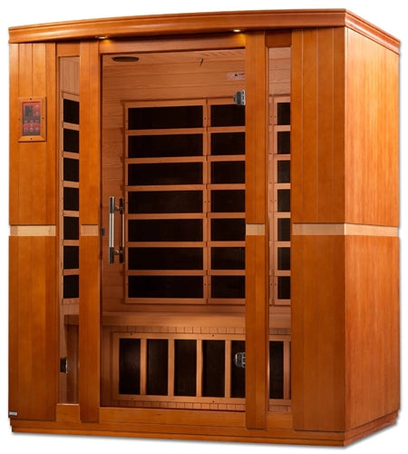 | GoldenDesigns DYN-6306-01 Dynamic "Bellagio" Low EMF Far Infrared Sauna, the Carbon Tech heating panels are engineered to produce a wider, softer heat that is evenly distributed throughout the sauna. Golden Designs Carbon Tech heating panels cover a significantly larger surface within the sauna. Dynamic Canadian Hemlock Saunas bring healthy living and longevity to the privacy of your home cost effectively. Modern technology and energy efficiency in FAR infrared carbon heating panels allow beneficial penetrating FAR infrared waves to remove body toxins, increase blood circulation, ease pain from sore muscles or aching joints, burn calories and improve skin tone among other benefits. Dynamic Low EMF FAR Infrared Saunas are constructed with the environment in mind which accounts for our efforts in using Reforested Canadian Hemlock wood. Our sauna walls are double paneled constructed with the thickest interior and exterior wood planks compared to others in the same industry. This all translates to a quality sauna that retains heat more efficiently, heats up faster and wastes less energy. Our Low EMF FAR infrared Carbon Energy Efficient heating panels are 30% larger than saunas heated by ceramic tubes and penetrate skin 40% more to maximize therapeutic benefits. Unlike ceramic heaters, you will never have to replace our Carbon Energy Efficient heating panels. Dynamic Saunas Carbon Energy Efficient panels also heat up 30% faster than saunas equipped with ceramic panels and 100% faster than rock and water steam saunas. Dynamic Saunas 3-person sauna is designed for ease of use and is an outstanding value. Enjoy the convenience of operating a Dynamic Sauna with our dual (interior and exterior) soft touch control panel and LED display featuring sauna temperature and time functions. Every Dynamic Sauna is equipped with a reduced wattage floor and lower bench heater to allow the same benefits and treatment to your legs and feet without the burning sensation of other sauna manufactures. Enjoy your sauna session with your favorite music through the sauna's built in MP3 auxiliary or Bluetooth connection with speakers. Dynamic Saunas enhances your sauna experience with Chromotherapy (color therapy) lighting system. The sauna plugs into a dedicated 20 amp 120 volt (Please consult with an electrician) and the sauna may be installed on carpet and at any indoor location including the basement, garage, master bath or walk in closet. Our sauna would be a beautiful and worthwhile addition to any fitness room. See and feel the difference today! Sauna Use: Indoor Only |