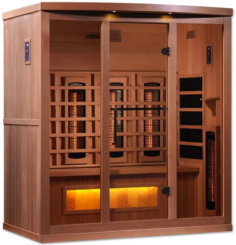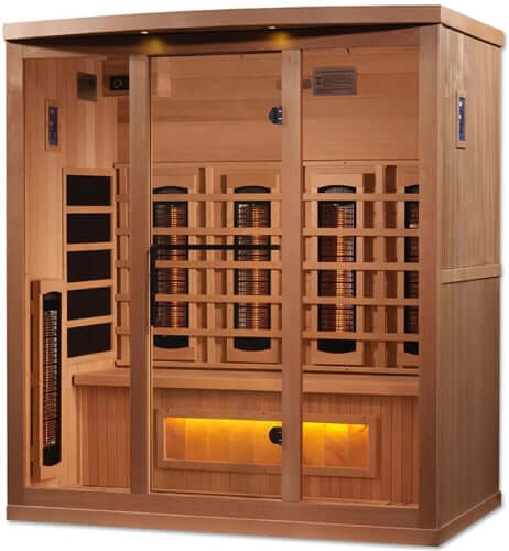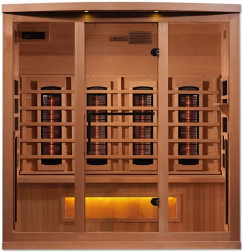 Low EMF: Golden Designs Saunas are constructed of reforested Canadian Hemlock wood planks that feature FAR Infrared Low EMF carbon heating panels. These saunas can be placed in any room of your home and can help relax and rejuvenate the body.